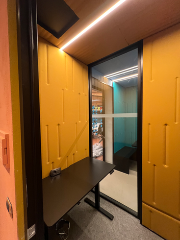 Questo cliente ha richiesto la realizzazione di piccoli ambienti per permettere al personale di fare chiamate o videochiamate senza disturbare il resto del team. Dopo aver costruito la struttura, abbiamo installato pannelli fonoassorbenti tagliati su misura, inseriti in profili neri per nascondere le giunture. Il risultato è un ambiente insonorizzato, dal design curato, che soddisfa pienamente le esigenze di lavoro.
